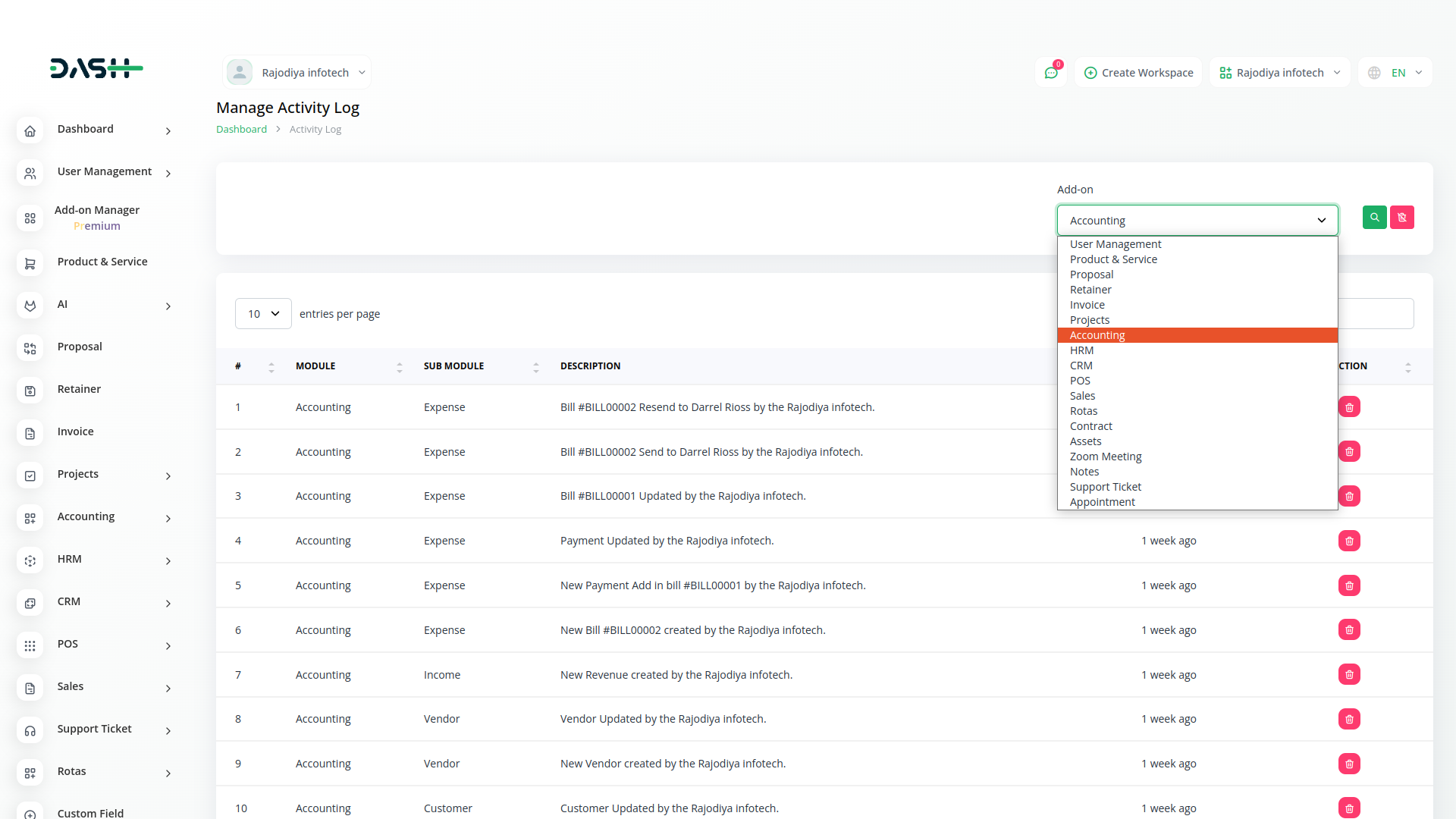 The activity log shows you the activity happening within the modules along with time and according to the appropriate formate. For example, when you create a new object inside any module and edit it, the activity log will show you that activity.