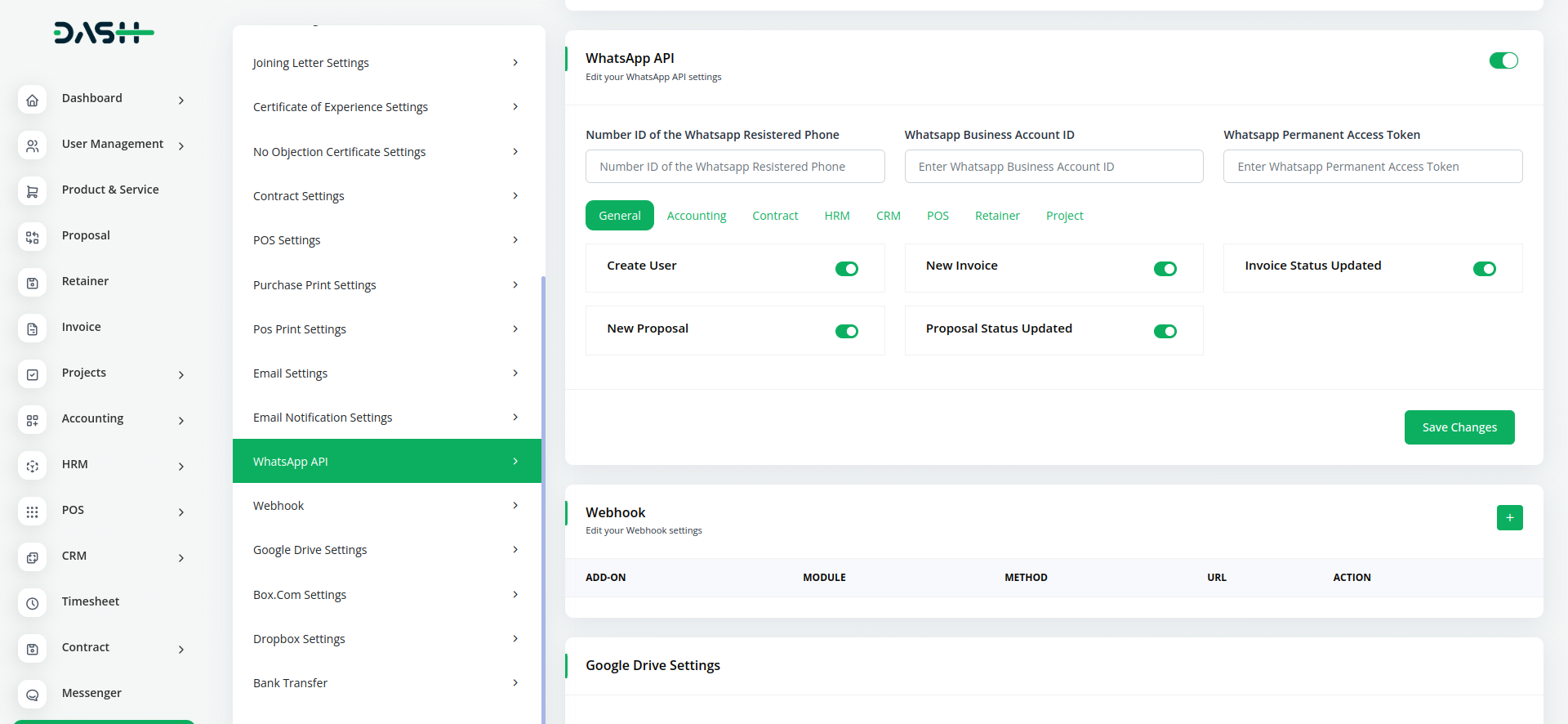 Workdo-Dash seamlessly integrates the WhatsApp API. This integration allows users to send WhatsApp messages triggered by specific events within the application. In the settings section, users have the ability to customize and manage event notifications by toggling them on or off as per their preferences. This feature enhances user engagement and facilitates efficient communication through WhatsApp messaging within the Workdo-Dash platform.